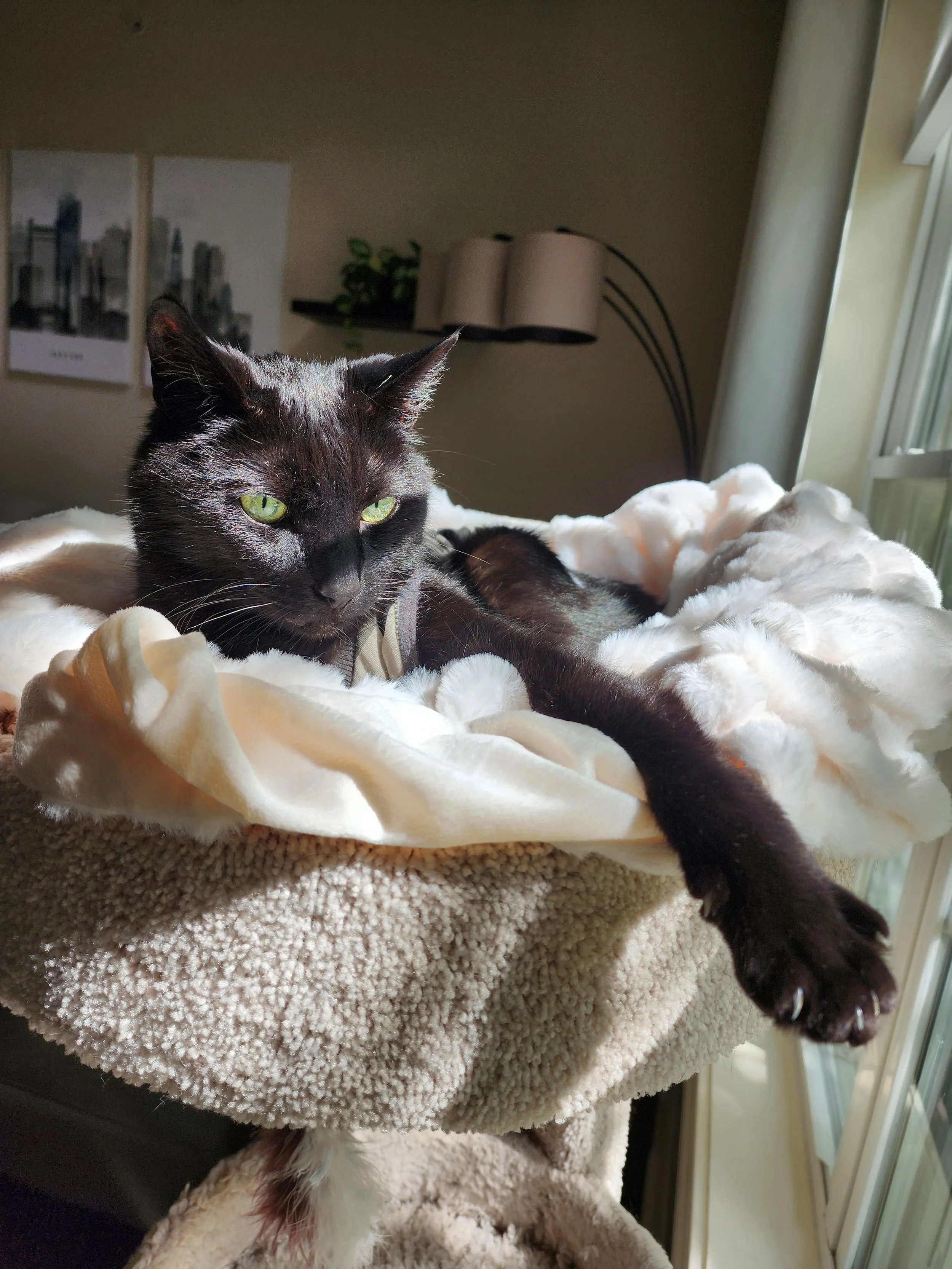As he's gotten older, he no longer jumps very high or plays very much. He sleeps a lot in the sun by the window in his cat tree, when he's not being tormented by the birds and squirrels.